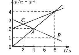 如图所示的速度——时间图象中,质点A、B、C运动的加速度分别为a A=________m/s2,a B=________m/s2,a C=________m/s2,其中________的加速度最大。在t=0时________的速度最大,在t=4s时________的速度最大,在t=________s时,A、B的速度大小一样大。![]()
