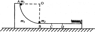如图所示,质量为m3=3 kg的滑道静止在光滑的水平面上,滑道的AB部分是半径为R=0.15 m的四分之一的圆弧,圆弧底部与滑道水平部分相切,滑到水平部分右端因定一个轻弹簧.滑道除CD部分粗糙外其他部分均光滑.质量为m2=2 kg的物体2(可视为质点)放在滑道的B点,现让质量为m1=1 kg的物体1(可视为质点)自A点静止释放.两物体在滑道BC之间相碰后并粘为一体(g=10 m/s2).