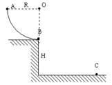 如图所示,质量为10kg的小球,从竖直圆弧轨道的A点由静止释放,沿1/4圆弧轨道运动至最低点B后飞出,落在水平面上的C点,已知落到C点时速度的大小为 25m/s,轨道半径和B点离地高度均为20m,不计空气阻力,g取10 m/s2,试求:![]()