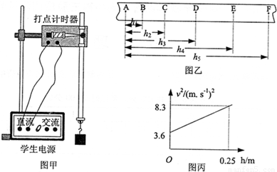 (2)该同学经修改错误并正确操作后得到如图乙所示的纸带,取连续六个点A、B、C、D、E、F为计数点,测得A点到B、C、D、E、F的距离分别为h1、h2、h3、h4、h5。若打点的频率为f,则打E点时重物的速度表达式VE= ;该同学先分别计算出各计数点的速度值,并试画出速度的二次方(V2)与对应重物下落的距离(h)的关系如图丙所示,则重力加速度g=___________m/s2。