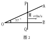 如图(2)所示,光滑轨道AOB固定在水平地面上,一直杆PQ沿轨道水平向右以8m/s的速度匀速运动且PQ总垂直于OB,若PQ足够长,∠AOB为370,则PQ与OA交点M的速度大小为(sin370="0.6 " cos370="0.8" )( )![]()