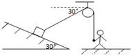 如图所示,人重300N,物体重200N,斜面粗糙,当人用100N的力竖直向下拉绳子时,物体仍处于静止状态,求①人对地面的压力;②物体对斜面的压力;③物体对斜面的摩擦力。