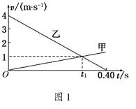 两物体甲和乙在同一直线上运动,它们在0~0.4 s时间内的v-t图象如图1所示.若仅在两物体之间存在相互作用,则物体甲与乙的质量之比和图中时间t1分别为 ( )![]()