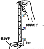 如图所示,请你的同学用手指拿着一把长30 cm的直尺,你的手离开直尺下端1 cm处,当他松开直尺,你见到直尺向下作匀加速运动时,立即用手抓着直尺,记录抓住处的数据,重复以上步骤多次.直尺下落的加速度为9.8 m/s2.现有A、B、C三位同学相互测定神经系统的反应时间,得到以下数据(单位:cm,注:计算结果保留两位有效数字).