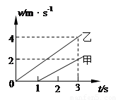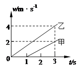 甲、乙两质点沿同一直线做匀加速直线运动的v-t图象如图所示,3 s末两质点在途中相遇。则![]()
