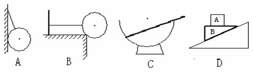 分别对下列A、B图中小球、C图中杆、D图中B物体作受力分析,并画出受力示意图。(A中小球用细绳挂在光滑的墙上,B中小球用细绳拴着搁在角上,C中杆放在光滑的半球型碗中,D中A、B两物体叠放在一起静止在斜面上,B的上表面水平)