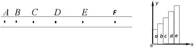 (8分)在“利用打点计时器测定匀加速直线运动加速度”的实验中,某同学在打出的纸带上每5点取一个计数点,共取了A、B、C、D、E、F六个计数点(每相邻两个计数点间的四个点未画出)如图所示。从每一个计数点处将纸带剪开分成五段(分别叫a、b、c、d、e段),将这五段纸带由短到长紧靠但不重叠地粘在xoy坐标系中,如图所示,由此可以得到一条表示v-t关系的图线,从而可求出加速度。![]()