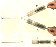 如图所示,用两个弹簧秤同时作用在水平橡皮筋上,使之沿水平方向伸长一定的长度,弹簧秤的读数分别为F1和F2;改用一个弹簧秤拉橡皮筋,使橡皮筋仍沿水平方向伸长相同的长度,弹簧秤的读数为F。这一实验直接说明