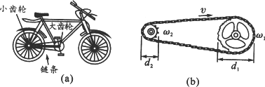 观察自行车的主要传动部件,了解自行车是怎样用链条传动来驱动后轮前进的,如图(a)所示,其中图(b)是链条传动的示意图,两个齿轮俗称“牙盘”.试分析并讨论: