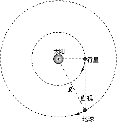 假设某次天文现象中,地球和某行星在同一轨道平面内同向绕太阳做匀速圆周运动,如图所示,地球的轨道半径为R,运转周期为T。地球和太阳中心的连线与地球和行星的连线所夹的角叫做地球对该行星的观察视角(简称视角)。已知该行星的最大视角为θ,当行星处于最大视角处时,是地球上的天文爱好者观察该行星的最佳时期。若某时刻该行星正处于最佳观察期,行星、地球的绕太阳的运行方向相同,如图所示,求: