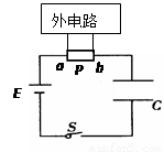 如图所示,平行板电容器C与一电源E连接, P为一自动控制元件,只有自a向b的电流通过P时,P才会自动控制外电路,关于该电路的工作原理,下列叙述正确的是