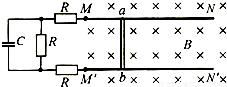 两根光滑的长直金属导轨M N、M′ N′平行置于同一水平面内,导轨间距为l ,电阻不计,M、M′处接有如图所示的电路,电路中各电阻的阻值均为尺,电容器的电容为C。长度也为l 、阻值同为R的金属棒a b垂直于导轨放置,导轨处于磁感应强度为B、方向竖直向下的匀强磁场中。a b在外力作用下向右匀速运动且与导轨保持良好接触,在ab运动距离为s的过程中,整个回路中产生的焦耳热为Q 。求