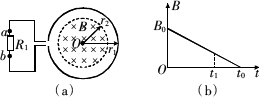 如图(a)所示,一个电阻值为R,匝数为n的圆形金属线圈与阻值为2R的电阻R1连接成闭合回路.线圈的半径为r1.在线圈中半径为r2的圆形区域内存在垂直于线圈平面向里的匀强磁场,磁感应强度B随时间t变化的关系图线如图(b)所示.图线与横、纵轴的截距分别为t0和B0.导线的电阻不计.求0至t1时间内,