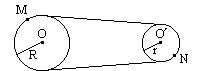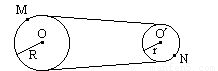如图所示,皮带传动装置,在运行中皮带不打滑,两轮半径分别为R和r,且r/R=2/3,M、N分别为两轮边缘上的点,则在皮带运行过程中,M、N两点的角速度之比为ωM:ωN= ;线速度之比VM:VN= ;向心加速度之比为aM:aN= 。