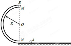 如图所示,圆管构成的半圆形竖直轨道固定在水平地面上,轨道半径为R,MN为直径且与水平面垂直,直径略小于圆管内径的质量为m的小球A以某一初速度冲进轨道,到达半圆轨道最高点M时与静止于该处的质量与A相同的小球B发生碰撞,碰后两球粘在一起飞出轨道,落地点距N为2R。重力加速度为g,忽略圆管内径,空气阻力及各处摩擦均不计,求: