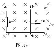 如图11所示,两根电阻忽略不计的平行光滑金属导轨ab、cd置于匀强磁场中,磁场方向垂直纸面向里,两导轨间的距离L=0.6m。电阻R=2Ω,金属杆MN阻值r=1Ω,当用外力F拉着金属杆MN沿两条导轨向右匀速滑动,速度v=10m/s,产生的感应电动势为3V。求: