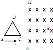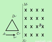 如图所示,一导线弯成边长为a的等边三角形闭合回路。虚线MN右侧有磁感应强度为B的匀强磁场,方向垂直于回路所在的平面。回路以速度v向右匀速进入磁场, AC边始终与MN垂直。从C点到达边界开始到A点进入磁场为止,下列结论正确的是