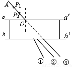 小明同学在实验室里用插针法测平行玻璃砖折射率的实验中,已确定好入射方向AO,插了两枚大头针P1和P2,如图所示(①②③是三条直线).在以后的操作说法中你认为正确的是: ![]()
