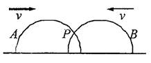 如图所示,A、B为半径相同的两个半圆环,以大小相同、方向相反的速度运动,A环向右,B环向左,则从两半圆环开始相交到最后分离的过程中,两环交点P的速度方向和大小变化为( )![]()