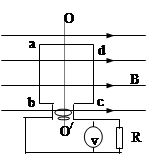 如图所示,n=10匝的边长为10cm的正方形线圈abcd绕对称轴OO/在匀强磁场中匀速转动,已知转动角速度ω=20rad/s,磁感应强度B=10T,外电阻R=6Ω,线圈的电阻r=4Ω。图示位置线圈平面与磁感线平行。求: