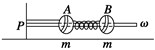 如图所示,质量均为m的两个小球A、B套在光滑水平直杆P上,整个直杆被固定在竖直转轴上。两球用劲度系数为k、自然长度为L的轻质弹簧连接在一起,A球被轻质细绳拴在竖直转轴上,细绳长度也为L。现使杆P、A、B绕转轴在水平面内以角速度