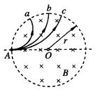 在半径为r的圆形区域内有一匀强磁场,磁场方向如图所示.一束速度不同的质子从磁场边缘的A点沿直径方向飞入磁场后,经不同路径飞出磁场,其中有三个质子分别到达磁场边缘的a,b,c三点.若不计质子间的相互作用力,比较这三个质子的运动情况,下面说法正确的是![]()