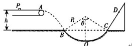 (17分)如图所示,水平传送带以一定速度匀速运动,将质量m=1kg的小物块轻轻放在传送带上的P点,物块运动到A点后被水平抛出,小物块恰好无碰撞地沿圆弧切线从B点进入竖直光滑圆弧轨道下滑.B、C为圆弧上的两点,其连线水平,已知圆弧对应圆心角