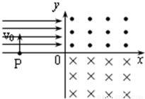 如图所示,在第二象限内有水平向右的匀强电场,电场强度为E;在第一、四象限内分别存在如图所示的匀强磁场,磁感应强度大小相等。有一个带电粒子以初速度v0从x轴上的P点垂直进入匀强电场,恰好与y轴45º角射出电场,再经过一段时间又恰好垂直于x轴进入下面的磁场。已知O、P之间的距离为d,则带电粒子