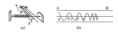 如下图(a)所示,在弹簧振子的小球上安装了一支记录用的笔P,在下面放一白纸带.当小球做简谐运动时,沿垂直于振动方向拉动纸带,笔P就在纸带上画出了一条振动曲线.已知在某次实验中沿如图(a)所示方向拉动纸带,且在某段时间内得到如图(b)所示的曲线.根据曲线回答下列问题: