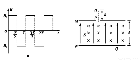 水平放置的平行金属板M、N之间存在竖直向上的匀强电场和垂直纸面的交变磁场(如图a所示,垂直纸面向里为正),磁感应强度B0=100T.已知两板间距离d=0.3m,电场强度E=50V/m, M板上有一小孔P,在P正上方h=5cm处的O点,一带电油滴自由下落,穿过小孔后进入两板间,最后落在N板上的Q点如图b所示.如果油滴的质量m=