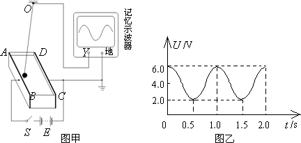 如图甲所示,ABCD为一液体槽,AB、CD面为铜板,BC、AD面及底面为绝缘板,槽中盛满导电液体(设该液体导电时不发生电解).现用质量不计的细铜丝在下端固定一铁球构成一单摆,铜丝的上端固定在O点,下端穿出铁球使得单摆摆动时细铜丝始终与导电液体接触,过O点的竖直线刚好在AD边的垂直平分面上.在铜板AB、CD面上接上图示电源,电源内阻可忽略,电动势E=8 V,将电源负极和细铜丝的上端点分别连接到记忆示波器的地和Y输入端(记忆示波器的输入电阻可视为无穷大).现将摆球拉离平衡位置,使其在垂直于AB、CD的竖直面内做简谐运动,闭合开关S,就可通过记忆示波器观察摆球的振动情况.图乙为某段时间内记忆示波器显示的摆球与CD板之间的电压波形,根据这一波形