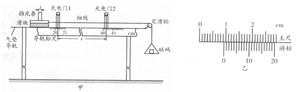 ②用游标卡尺测量挡光条的宽度,结果如图乙所示,由此读出__▲______mm;