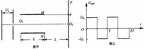(3)若偏转电场两板间的电压按如图乙所示作周期性变化,要使电子经加速电场后在t=0 时刻进入偏转电场后水平击中A点,试确定偏转电场电压U0以及周期T分别应该满足的条件.