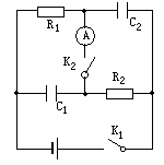 如图所示电路中,电容器C1=4.0μF,C2=3.0μF,电阻R1=8.0Ω,R2=6.0Ω,闭合电键K1,电路达稳定后,再闭合电键K2,电容器C1的电量减小量与电容量C2的电量减小量之比是16∶15;电键K2闭合时电流表的示数为1.0A,求电源的电动势和内电阻.