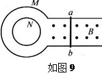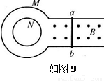 如图9所示,在匀强磁场中放置一个电阻不计的平行金属导轨,导轨跟大线圈M相连,导轨上放一根导线ab,磁感线垂直于导轨所在平面,欲使M所包围的小闭合线圈N产生顺时针方方的感应电流,则导线的运动情况可能是( )![]()