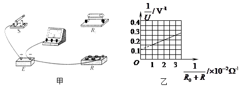 一种供实验使用的小型电池电动势在9V左右,内阻约为40Ω,电池允许最大输出电流为50 mA,为了准确测定这个电池的电动势和内阻,用图甲所示的实验器材进行测量(图中电压表内阻很大,可不考虑它对测量的影响),R为电阻箱,阻值范围为0~9999Ω,R0是保护电阻。