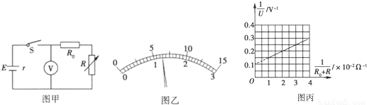 (3)(2分)该同学完成电路的连接后,闭合开关S,调节电阻箱的阻值,读取电压表的示数,其中电压表的某一次偏转如图丙所示,其读数为_ __V