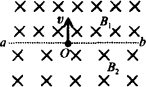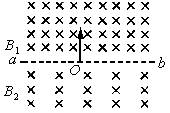 以ab为界面的两匀强磁场,磁感应强度B1=2B2=0.314T。有一质量m=6.64´10-27kg、电荷量q=3.2´10-19C的a粒子从ab界面上的O点以垂直界面ab、垂直磁场方向的初速度v0进入匀强磁场B1中,如图所示。经过________s,a粒子将再次通过O点。