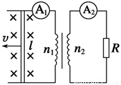 如图10所示,理想变压器原、副线圈的匝数比n1∶n2=4∶1,当导体棒l在匀强磁场中向左做匀速直线运动切割磁感线时,电流表