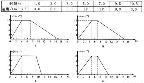一辆汽车在平直的公路上从静止运动,先后经历匀加速、匀速、匀减速直线运动最后停止。从汽车启动开始计时,下表记录了汽车某些时刻的瞬时速度,根据数据可判断出汽车运动的v – t 图象是