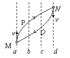图中的虚线a、b、c、d表示匀强电场中的4个等势面。两个带电粒子M、N(重力忽略不计)以平行于等势面的初速度射入电场,运动轨迹分别如图中MPN和NQM所示。已知M是带正电的带电粒子。则下列说法中正确的是![]()