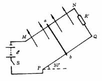 如图所示,MN、PQ为平行光滑导轨,其电阻忽略不计,与地面成30°角固定。N、Q间接一电阻R′=1.0Ω,M、P端与电池组和开关组成回路,电动势ε=6 V,内阻r=1.0Ω,导轨区域加有与两导轨所在平面垂直的匀强磁场。现将一条质量m=40g,电阻R=1.0Ω的金属导线置于导轨上,并保持导线ab水平。已知导轨间距L=0.1m,当开关 S接通后导线ab恰静止不动。