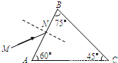 20.(6分)图示是一种折射率n=1.5的棱镜,用于某种光学仪器中,现有一束光线沿MN的方向射到棱镜的AB界面上,入射角的大小i = arcsin0.75.求:![]()