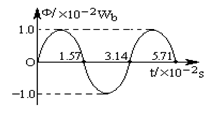 一小型发电机内的矩形线圈,在匀强磁场中以恒定的角速度ω绕垂直于磁场方向的固定轴转动,线圈匝数n=100,穿过每匝线圈的磁通Φ 随时间t按正弦规律变化,如图14所示.发电机内阻r=5.0Ω,外电路电阻R=95Ω.已知感应电动势的最大值Em=nωΦm,其中Φm为穿过每匝线圈的磁通量的最大值.则: