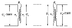 (10分)如图所示,一小型发电站通过升压变压器B1和降压变压器B2把电能输送给用户(B1和B2都是理想变压器),已知发电机的输出功率为500kW,输出电压为500V,升压变压器B1原、副线圈的匝数比为1﹕10,两变压器间输电导线的总电阻为2Ω,降压变压器B2的输出电压为220V。求:![]()