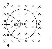 用电阻为18Ω的均匀导线弯成图示中直径D=0.80m的封闭金属圆环,环上AB弧所对圆心角为60度,将圆环垂直于磁感线方向固定在磁感应强度B=0.50T的匀强磁场中,磁场方向垂直于纸面向里。一根每米电阻为1.25Ω的直导线PQ,沿圆环平面向左以3.0m/s的速度匀速滑行(速度方向与PQ垂直),滑行中直导线与圆环紧密接触(忽略接触处电阻),当它通过环上A、B位置时,求: