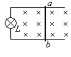 (10分)如图所示,小灯泡的规格为“2V、4W”,连接在光滑水平导轨上,两导轨相距0.1m,电阻不计,金属棒ab垂直搁置在导轨上,电阻1Ω,整个装置处于磁感强度B=1T的匀强磁场中,为使小灯正常发光,求: