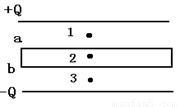 如图所示,一平行板电容器,带电量为Q,上极板带正电,下极板带负电,在两板中间放入一不带电的导体(宽度小于板间距),在板中间有三点1、2、3,对应的场强分别是E1、E2、E3把导体移走后三点的场强分别是E1’、E2’、E3’,则下列说法正确的是( )