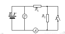 (15分)在如图所示的电路中,电阻R1=2Ω,R2=3Ω。当电键K断开时,电流表示数为I1=0.5A。当K闭合时,电流表示数为I2=1.0A。求:![]()