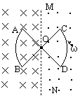 如图所示,在直线MN右边的磁场方向垂直纸面向外,磁感强度B=0.3T,左边是与它方向相反,磁感强度大小相等的磁场。用一根电阻为R=0.4Ω的导线制成一个半径为r=0.1m,顶角为90°角的两个角交叉的闭合回路ABCDA。回路在磁场中以MN上的一点O为轴,以角速度ω=200rad/s顺时针方向转动。求:若以OA边恰在OM位置开始计时,回路转过1/4周期的时间内,感应电流多大?方向如何?